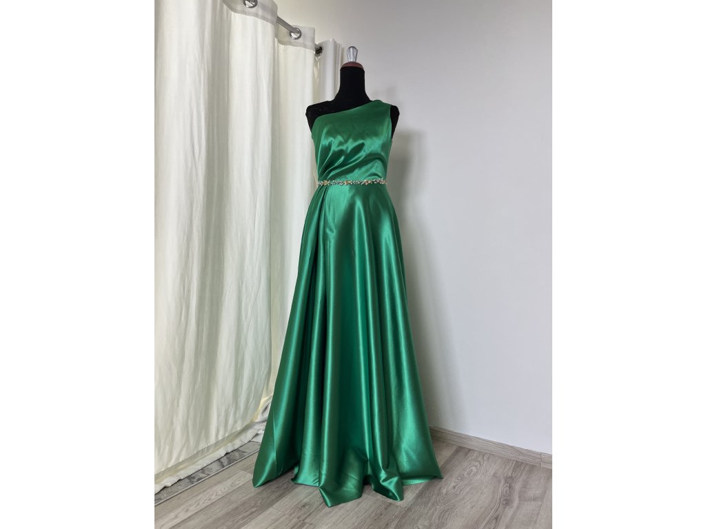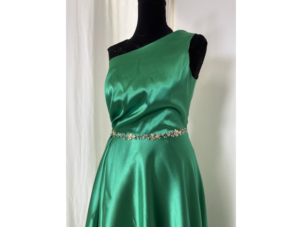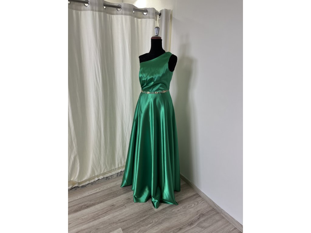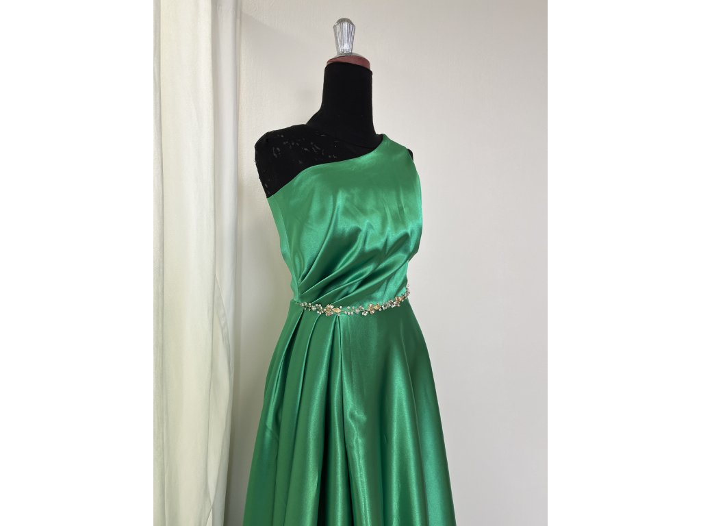 Saténové spoločenské šaty v žiarivej zelenej farbe sa dokonale hodia na blížiacu sa plesovú, či stužkovú sezónu. Vrchný diel šiat je na jedno rameno a sukňa šiat je veľká polkruhová so záhybmi a rázporkom. Šaty šijeme u nás v salóne v roznych veľkostiach a farbách. Skladom veľkosť 40. Šaty sú doplnené o štrasový opasok
