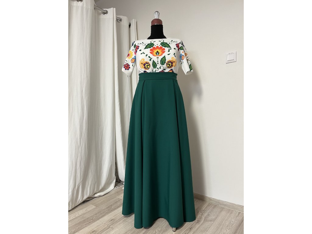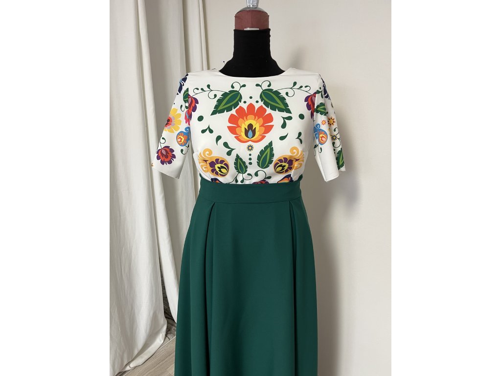 Spoločenské šaty s ľudovím motívom na vrchnom diely. Materiál vrchného dielu je mierne elastický, príjemný na dotyk, sukňa je z pevnejšieho materiálu, aby pekne stála. Zapínanie je vzadu na zips. Skladom veľkosť 48, obvod hrude 110cm, obvod pása 94cm.