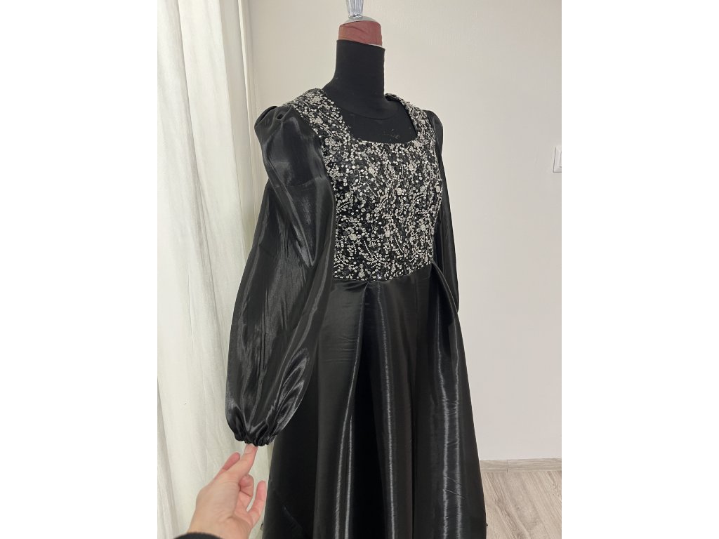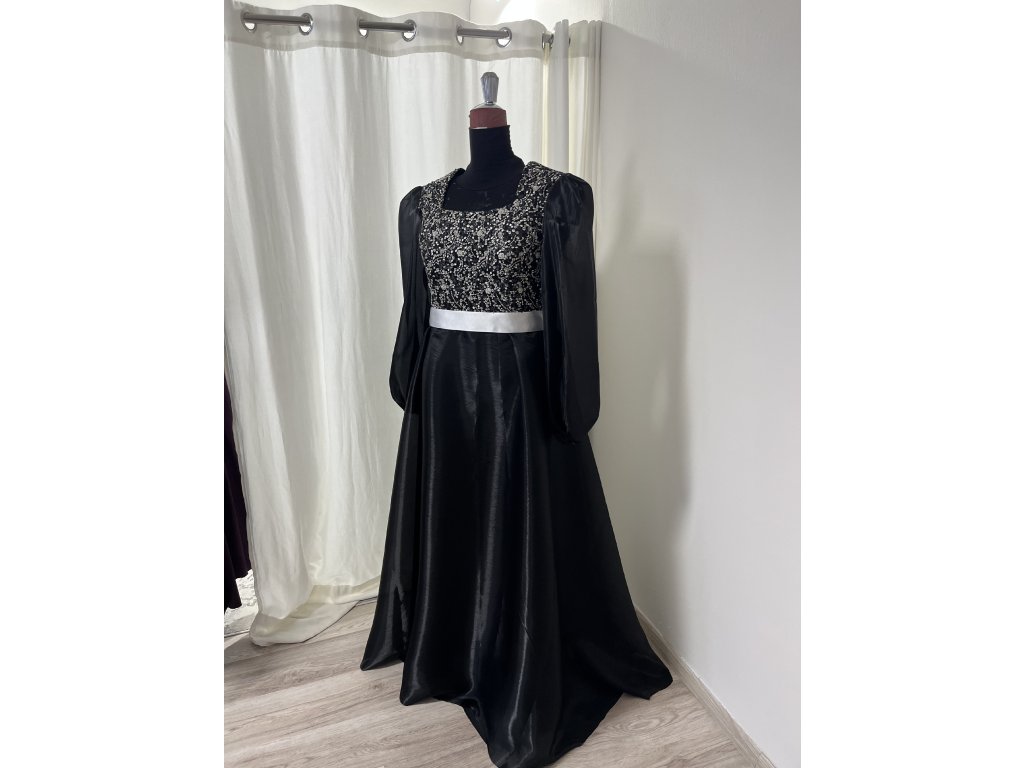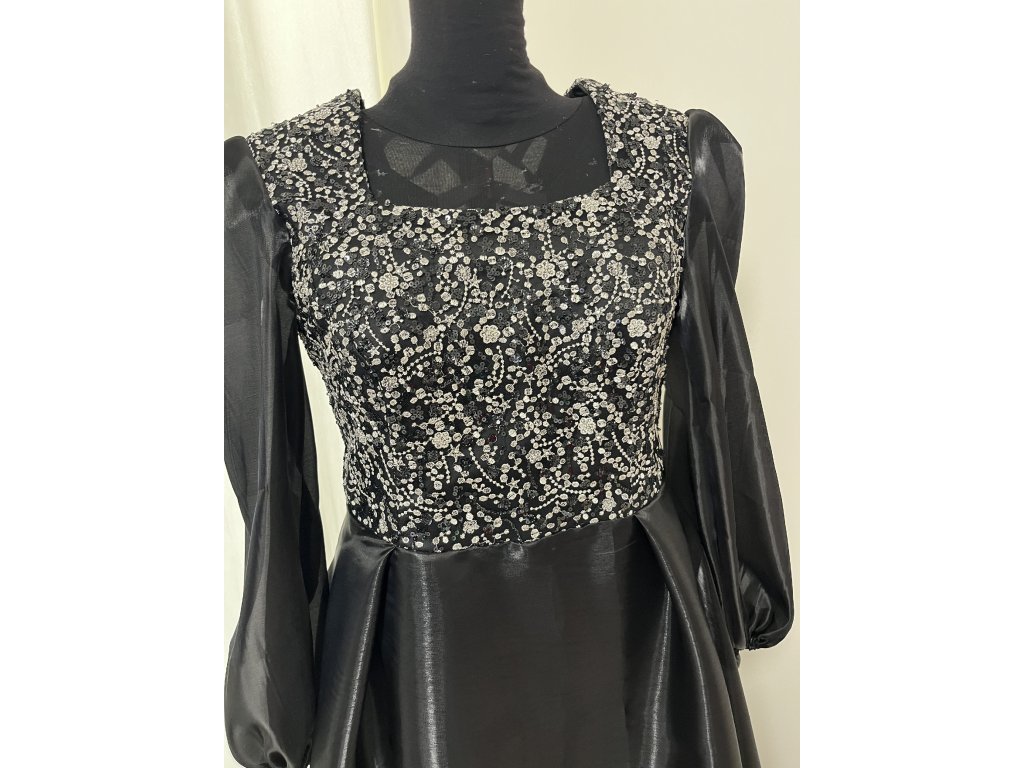 Čierne spoločenské šaty s organzovou nadýchanou sukňou a puff rukávmi. Vrchný diel je ušitý z bohato zdobenej krajky, sukňa je maxi polkruhová. Zapínanie je vzadu na zips. Šaty majú princes strih. Vieme ich ušiť aj v inej veľkosti.