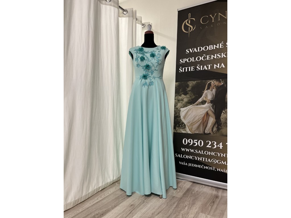 Nežné spoločenské šaty Nelly sú ladené do pastelových farieb na letnú sezónu. Šaty sú ušité z mierne elastickeho materiálu, príjemného na dotyk. Majú maxi sukňu a členený vrchný diel, ktorý je zdobený kvetinovou 3D krajkou. Zapínanie šiat je vzadu na zips a mašľu. Šaty sú šité u nás v salóne. Farba šiat je mentolová s tyrkysovými kvetmi.