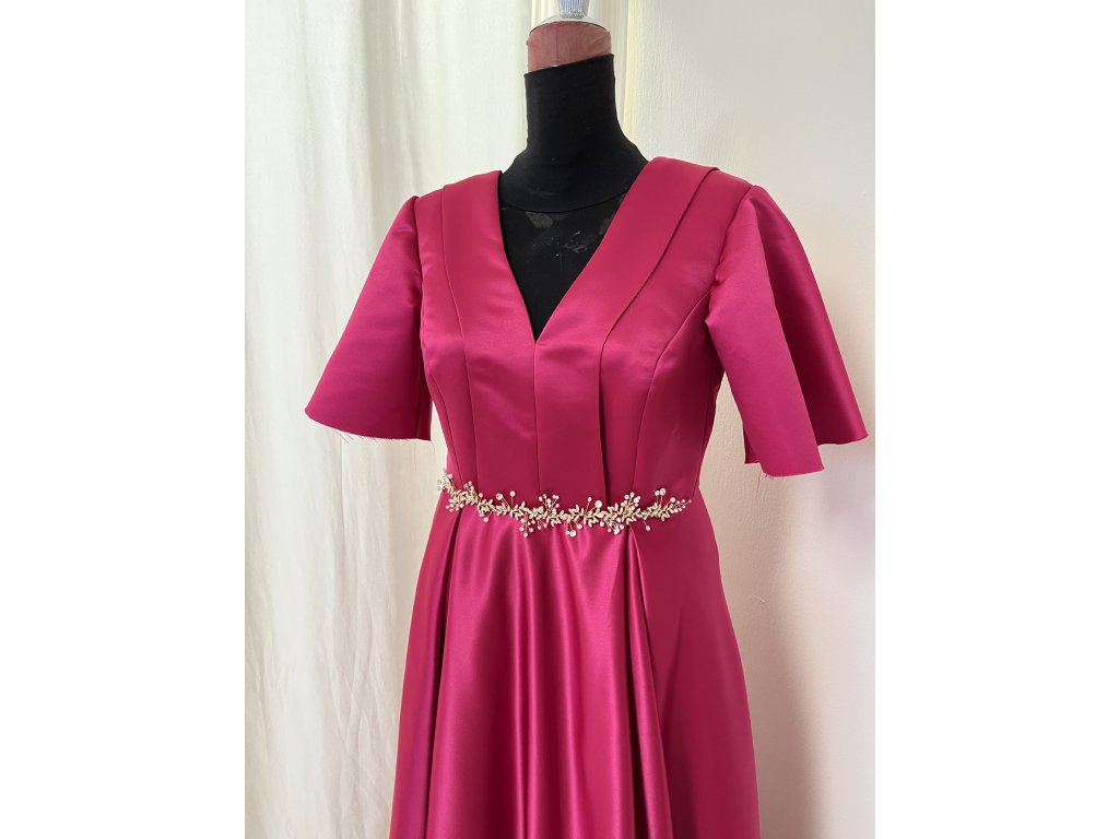 Cyklamenové spoločenské šaty ušité z pevného saténu, aby krásne stála sukňa a pekne tvaroval vrchný diel. Zaujímavosťou šiat je jeho členený vrchný diel.N Zapínanie je na šnurovačku, aby sa lepšie prispôsobili postave. Šaty sú doplnené o opasok. Sú šité u nás v salóne a vieme ich ušiť v rôznych veľkostiach. Možnosť zapožičania v salóne. Cena na predaj 259€