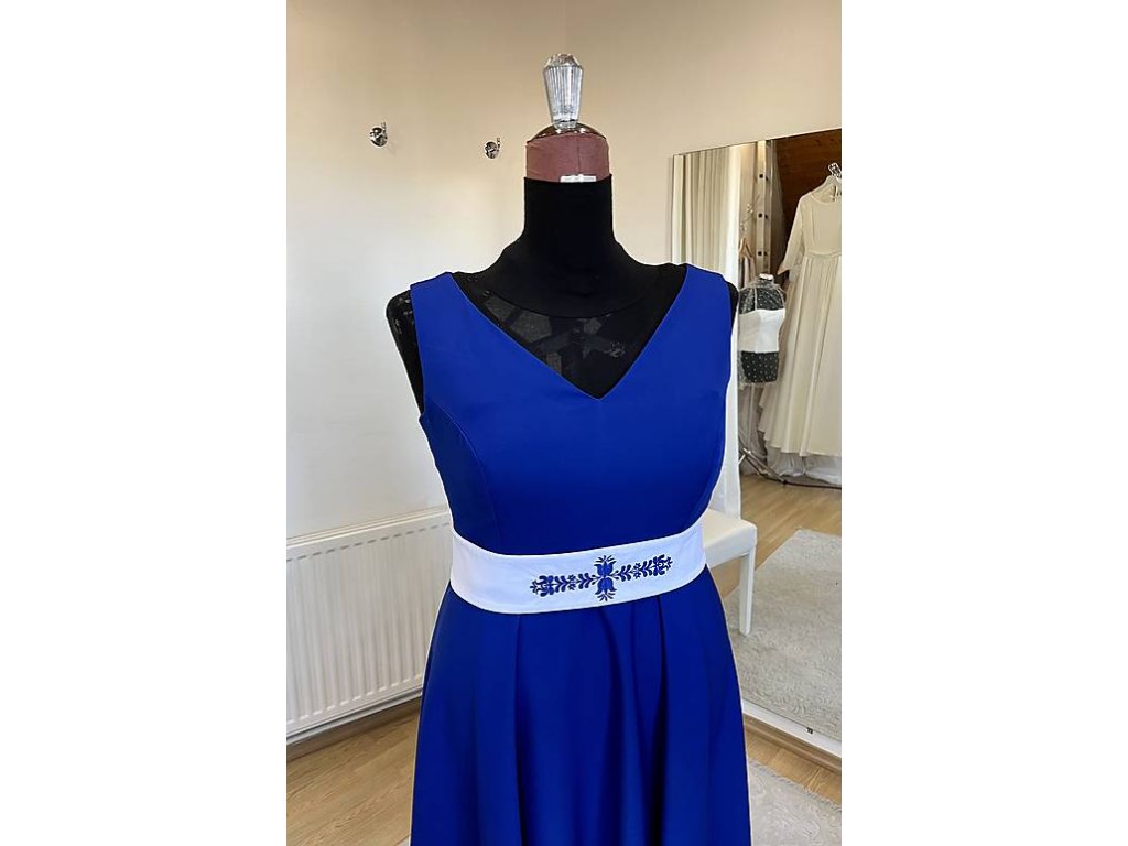 Krátke šaty v kráľovskej modrej farbe vhodne na spoločenskú udalosť, ale aj na bežné nosenie. Vrchný diel šiat je princes strihu, sukňa je polkruhová so záhybmi. Šaty sú doplnené o vyšívaný opasok.