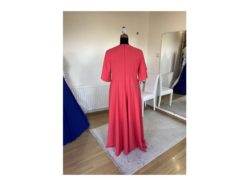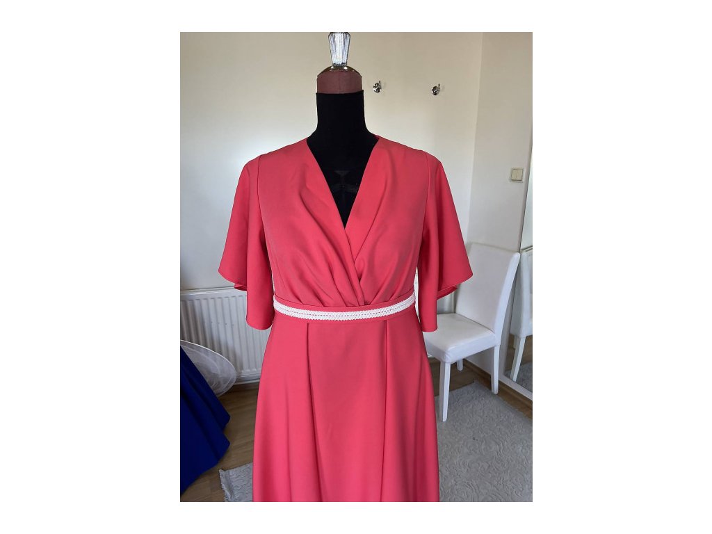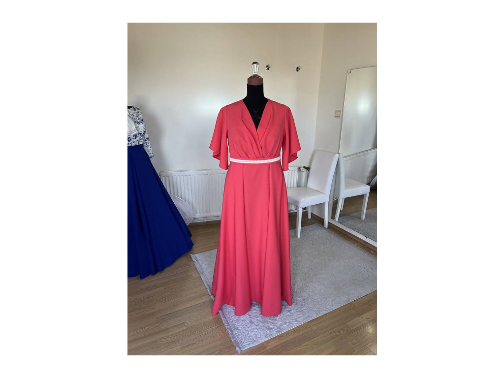 Spoločenské šaty zavinovacieho typu s polkruhovou sukňou. Šaty môžu byt doplnené aj o štrasový opasok. Farba šiat na foto je korálová, na požiadanie ušijeme aj v iných farbach. Šaty šijeme na objednávku podľa mier. Stačí ich napisat do poznámky.