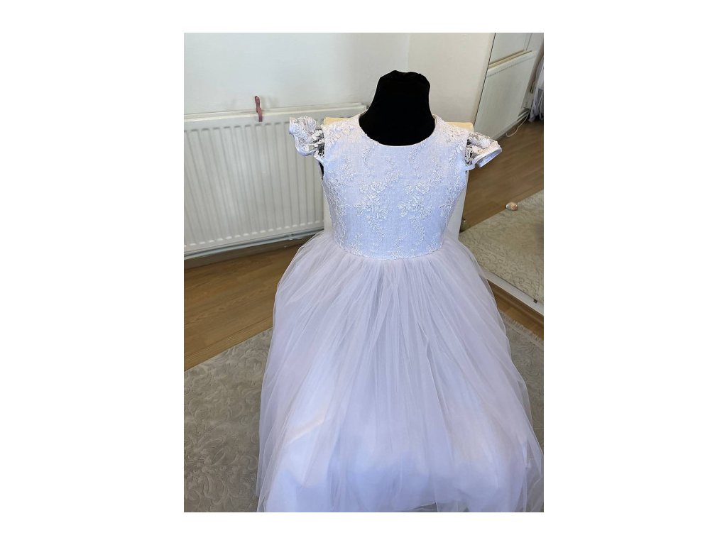 Detské šatičky v bielej farbe. Vrchný diel je krajkovaný, zapínanie je na zips. Sukňa je viacvrstvová tylová. Saty šijeme vo viacerych veľkostiach na objednávku. Skladom veľkosť 134 Cena na požičanie 55€, možnosť zapožičania v salóne