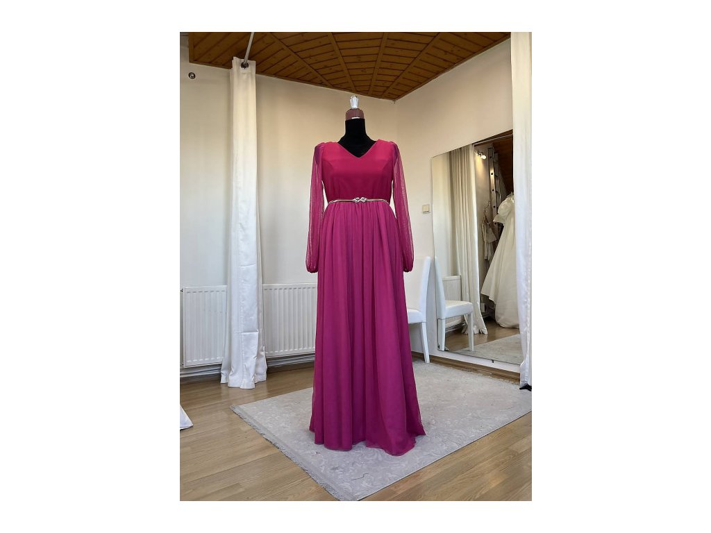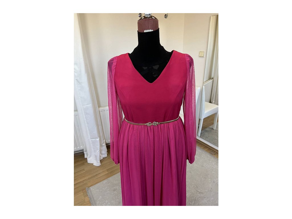 Spoločenské šaty v Magenta farbe. Strih šiat je princes, sukňa je riasená z elastického tylu, rukávy dlhé tylové, zakončené na gumičku. Šaty môžu byť doplnené o opasok, ktorý však nie je v cene šiat.