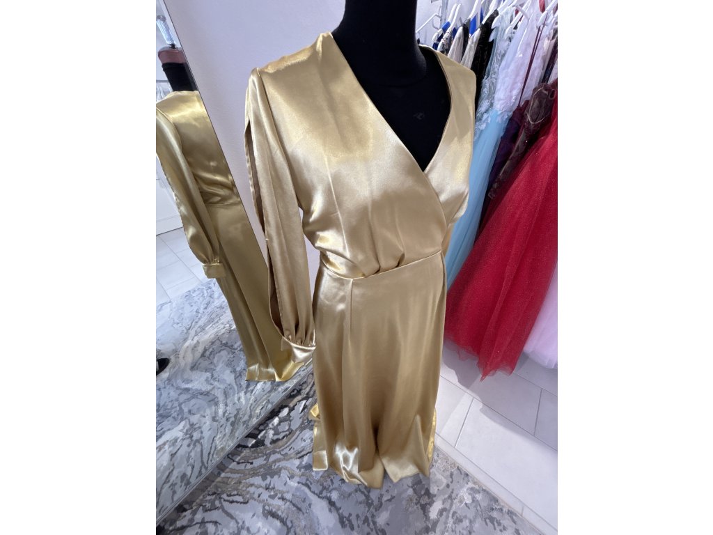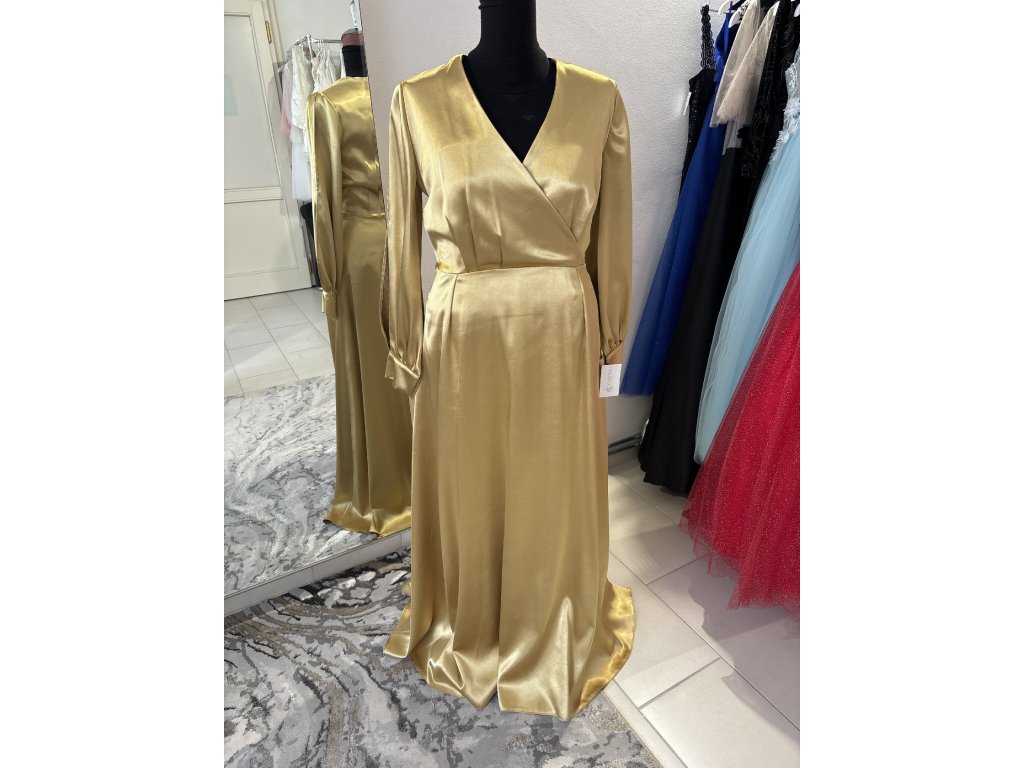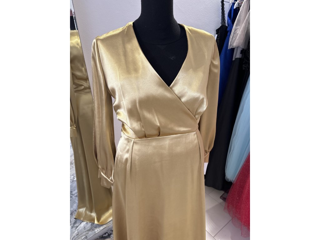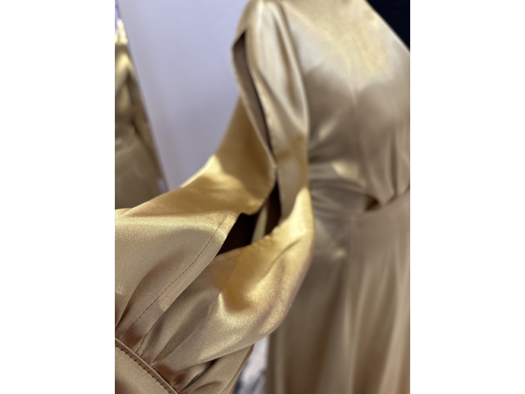 Žiarivé spoločenské šaty ušité zo zlatého taft saténu. Sú v zavinovacom štýle, s padavou sukňou. Šaty majú rozstrihnuté balónikové rukávy zakončené na manžetu. Šaty šijeme u nás v salóne v rôznych veľkostiach aj na diaľku.