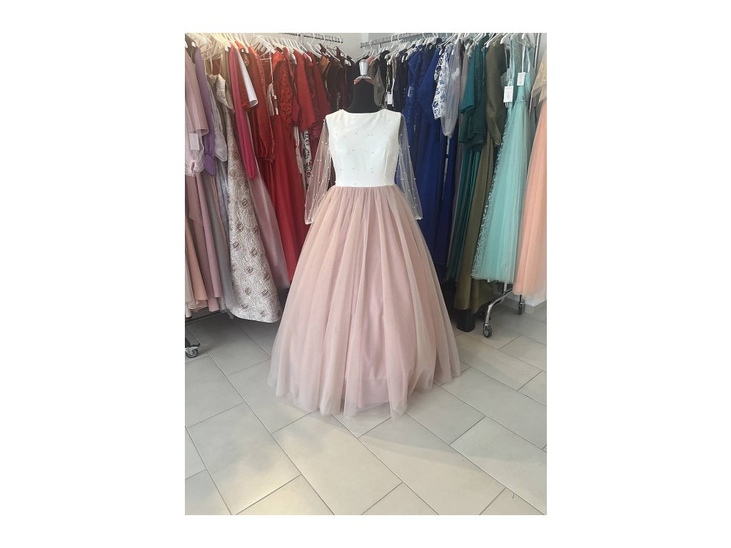 Tylové spoločenské šaty v kombinácií ivory a staroružová. Vrchný diel šiat je zdobený perličkami. Šaty majú lodičkový výstrih vpredu a V-čkový vzadu. Zapínanie na zips. Šaty šijeme v rôznych veľkostiach podľa zaslaných mier.