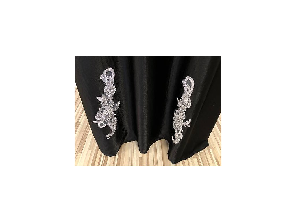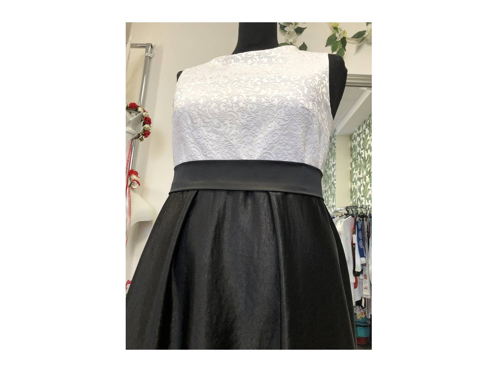 Vrchný diel šiat je z bieleho žakéru, dlhá padavá sukňa z jemného saténu, zdobená krajkovou aplikáciou. Nestarnúca kombinácia bielej a čiernej farby, ktorou nič nepokazíte.
