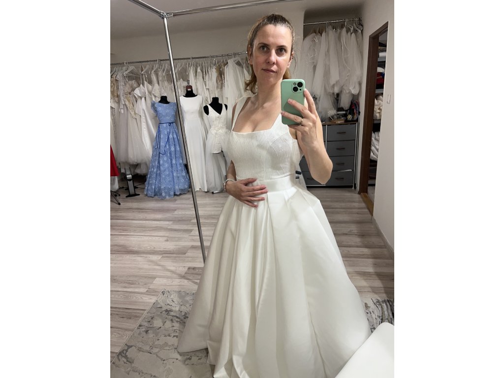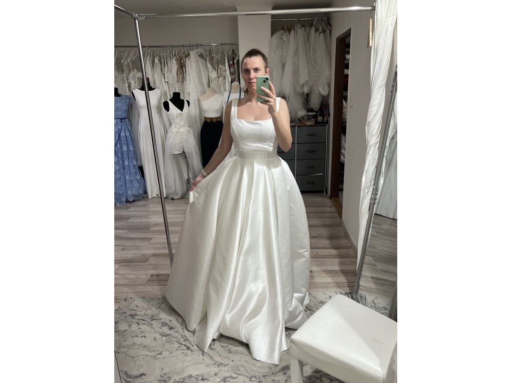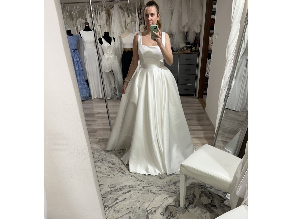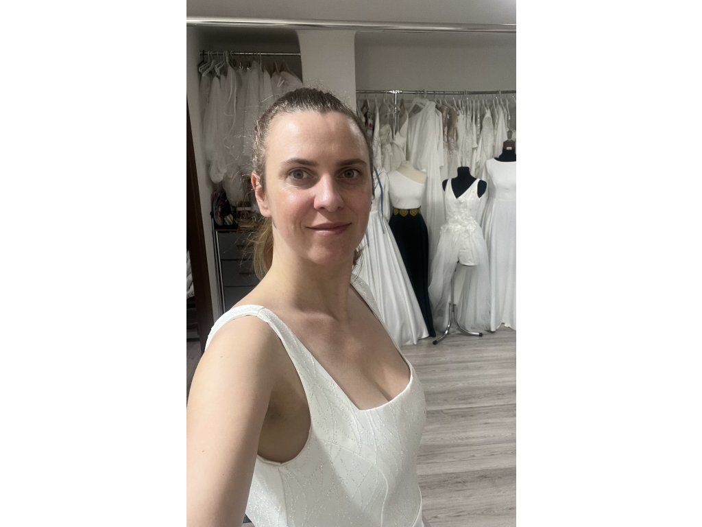 Honosné svadobné šaty Elizabeth sú ušité u nás v dielni v ivory farbe. Sukňa šiat je maxi kruhová so záhybmi. Vrchný diel je so saténu, potiahnutý trblietavým tylom. Princes strih dokonale tvaruje postavu. Zapínanie vzadu na zips, pri šití na mieru si viete doladiť detaily zapínania ( zips, alebo šnurovačka), prispôsobiť si strih, alebo materiál. Možnosť všiť vrecká. Skladom veľkosť 38 a 40.