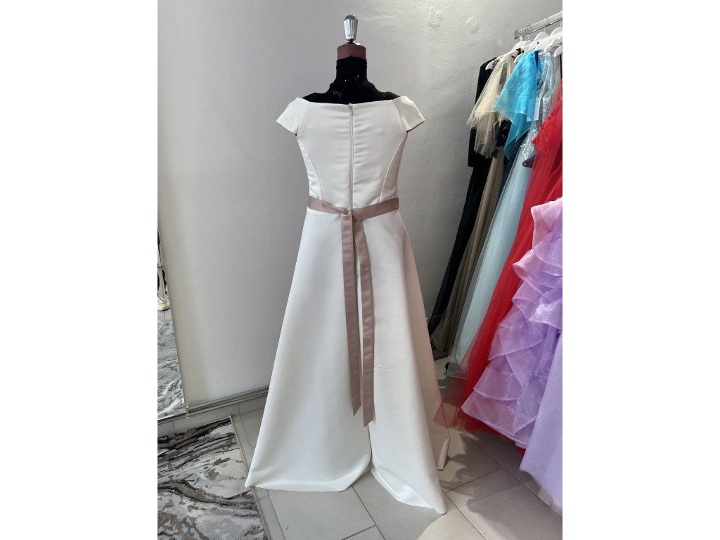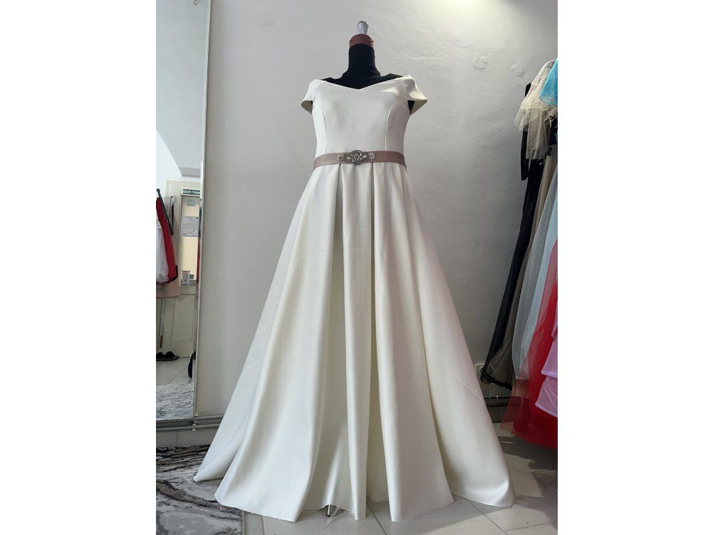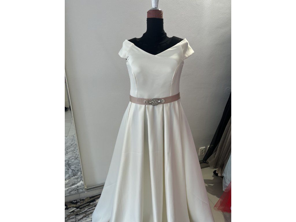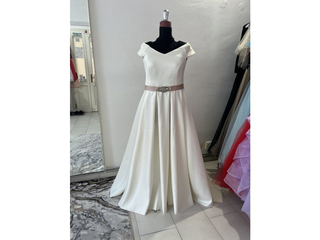 Svadobné šaty Even sú ušité z ivory saténu. Majú hladkú líniu, polkruhovú suknu so zahybmi. Šaty sú doplné o štrasový opasok v svetlohnedej farbe. Zapínanie je vzadu na zips. Šaty sú site u nás v salóne. Obvod hrude 100cm obvod pása 84cm