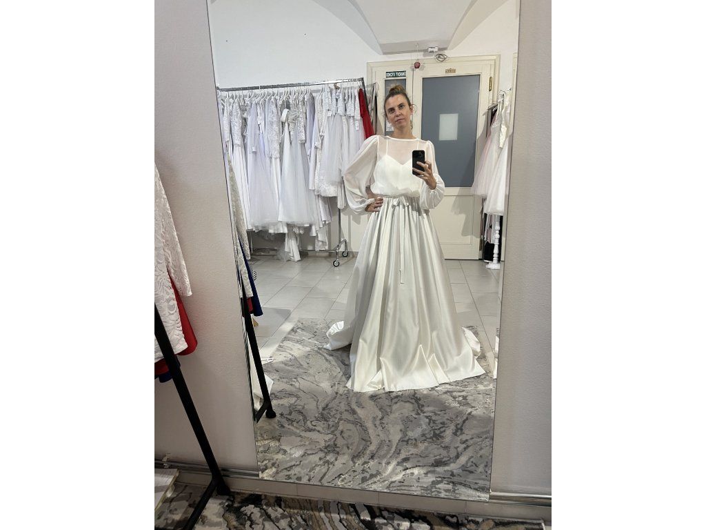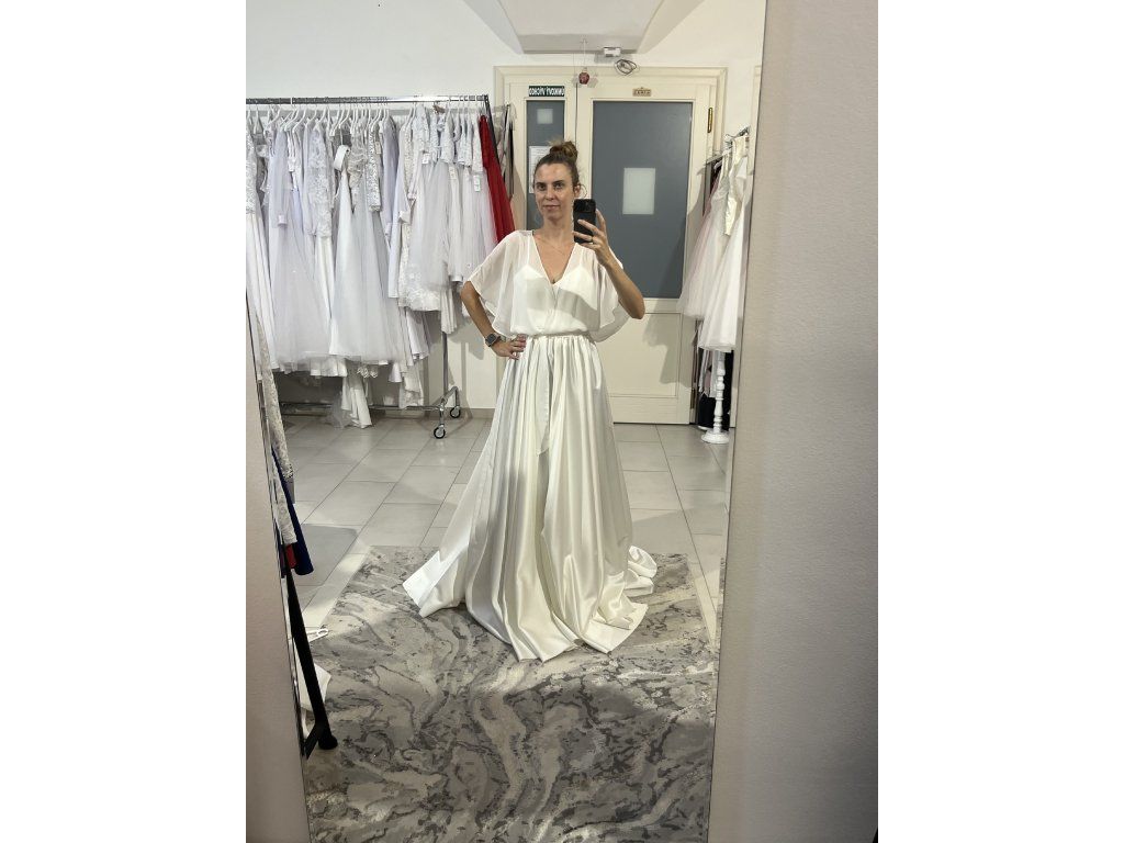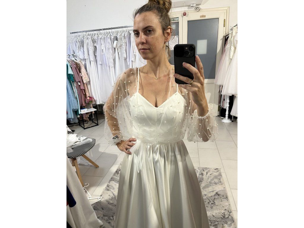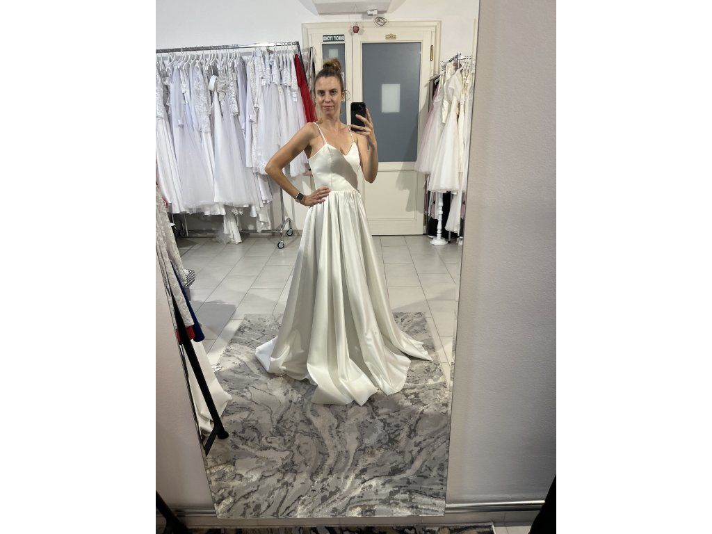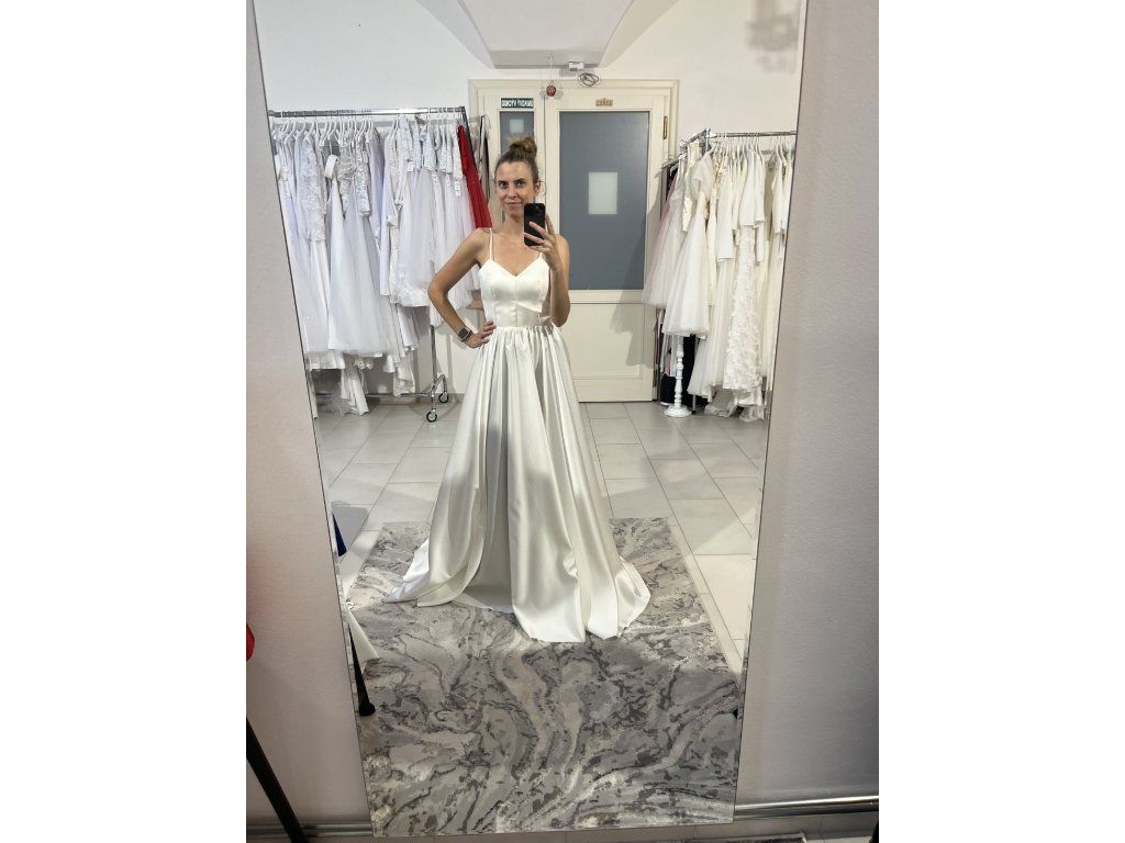 Saténové svadobné šaty v ivory farbe. Vrchný diel šiat je korzetový, na tenké ramienka. Sukňa je bohatá kruhová so záhybmi. V týchto šatách sa spája minimalizmus s eleganciou. Šijeme ich u nás v salóne, aj na diaľku v rôznych veľkostiach. Skladom veľkosť 40. Celé svadobné šaty viete obzvláštniť šifónovým, perličkovým, či krajkovaným bolerkom.