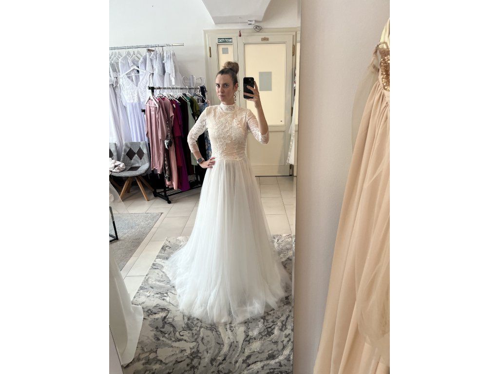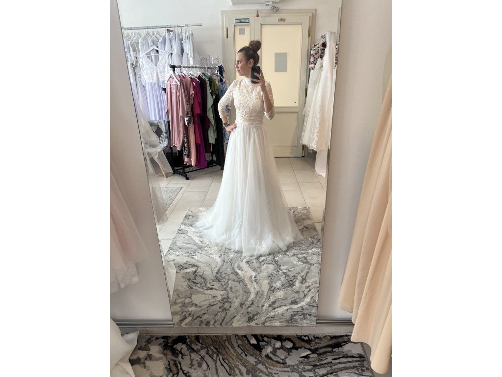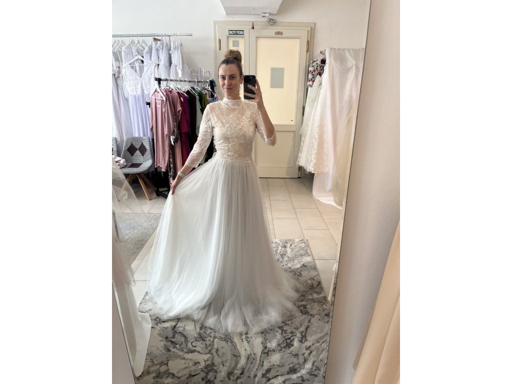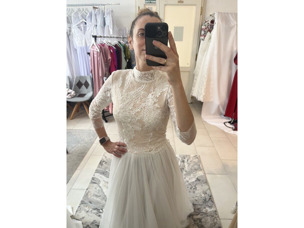 Svadobné šaty sú v ivory farbe. Vrchný diel je z príjemnej francúzskej krajky, vyšívaný malými korálkami. Predný diel je podšitý telový elastický materiálom. Šaty majú 3/4 rukáv a zaujímavosťou je stojačik. Sukňa je ľahká viacvrstvová tylová. Zapínanie je vzadu na zips.