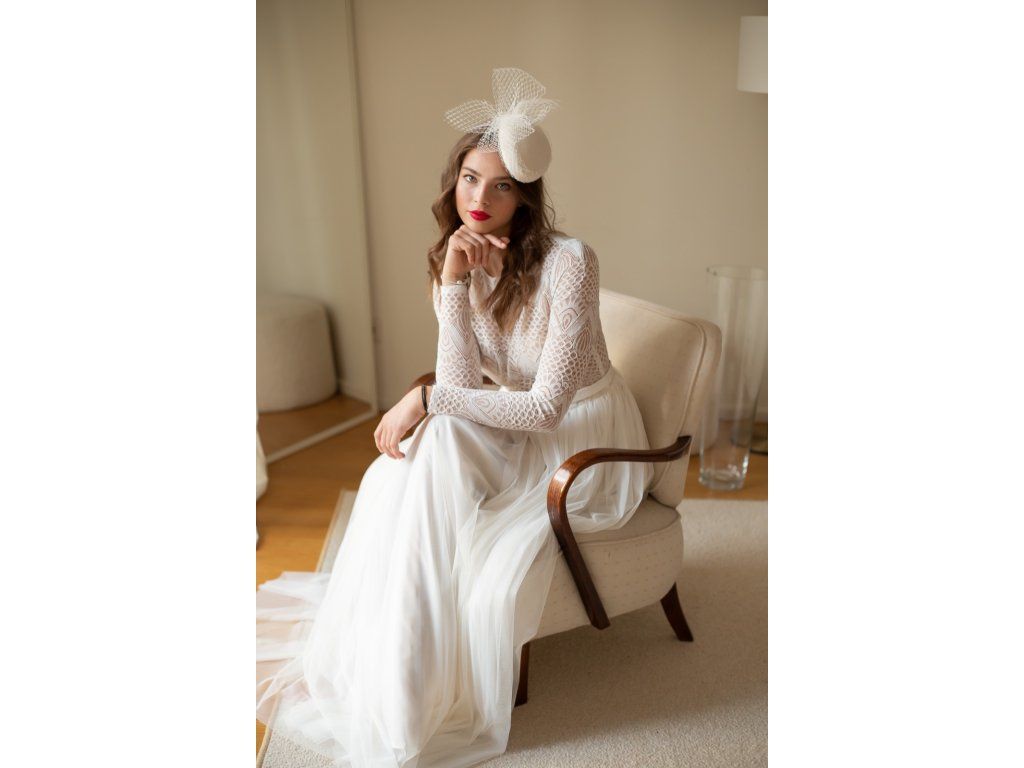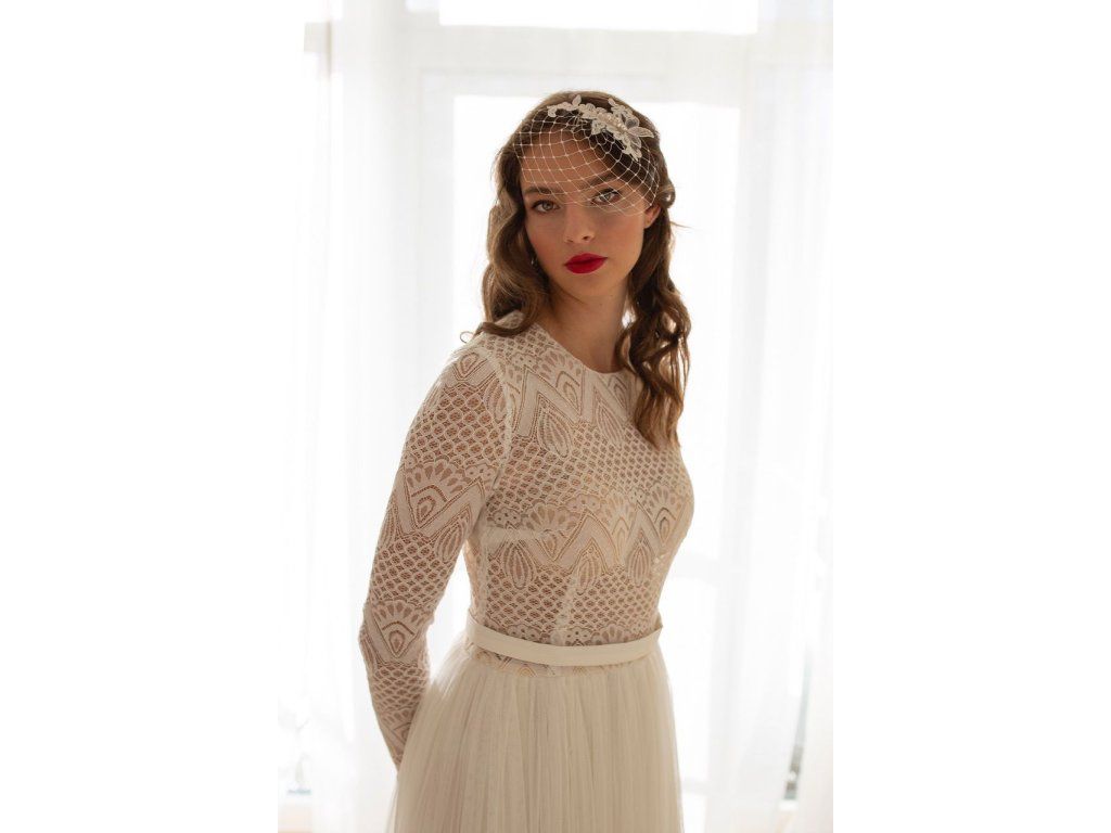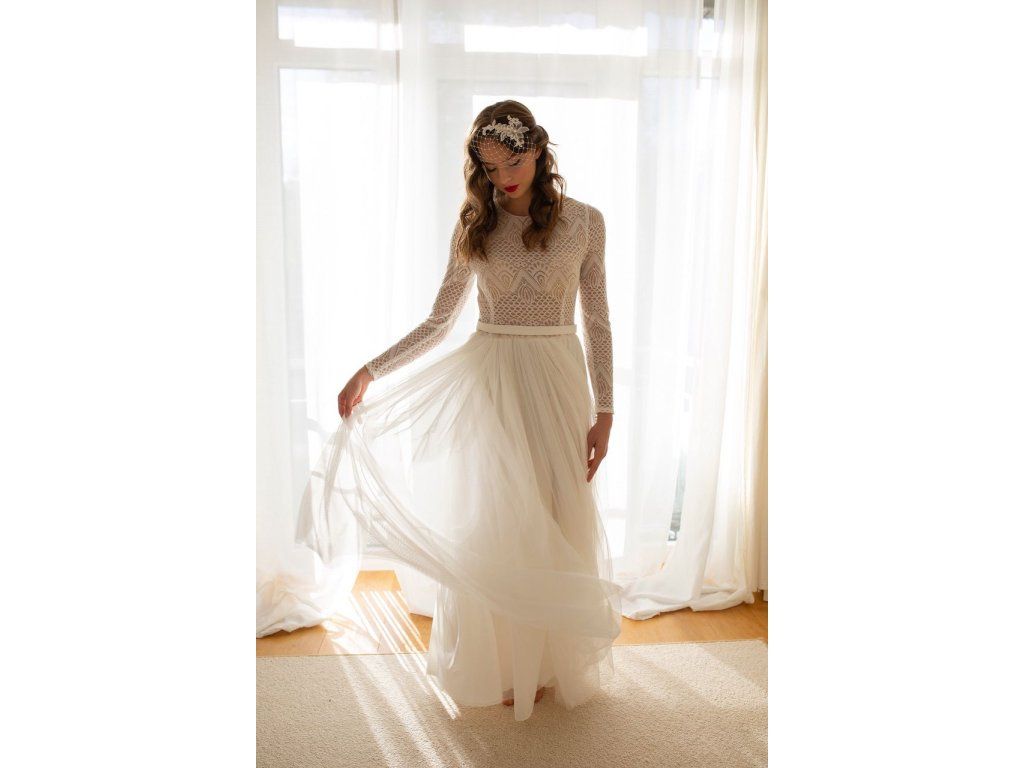 Tieto svadobné šaty sú úplne ľahučké v ivory farbe. Vrchný diel majú zdobený elastickou boho geometrickou krajkou. Sukňa je z elastického tylu, riasená. Zapínanie vzadu na zips. Šaty sú ušité u nás v salóne. Šijeme ich v rôznych veľkostiach, aj na diaľku, stačí zaslať vaše miery. Skladom veľkosť 38