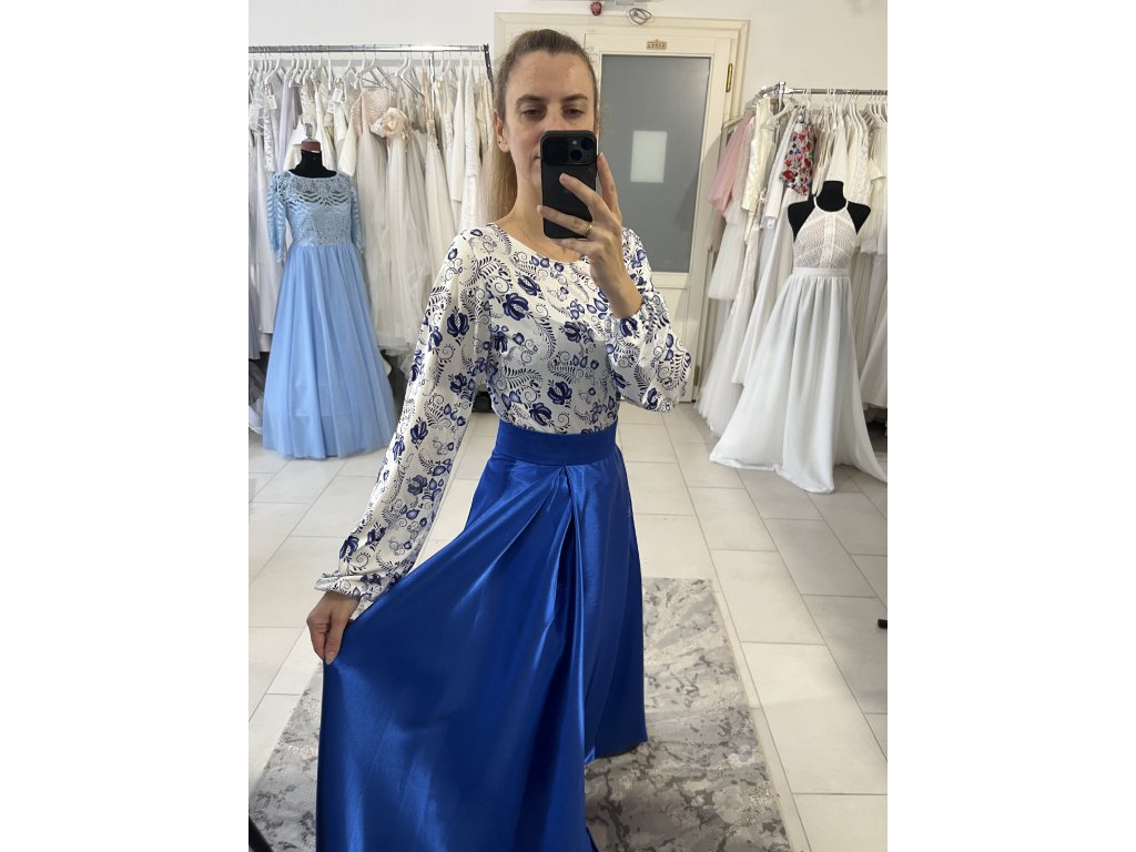 Veľmi príjemný, ľahučký, elastický top s potlačou. Vzor pripomína folk cibuľak. Strih rukáva je mierne rozšírený, zajončený na gumku. Materiál je z lícnej strany hladký, lesklý a z rubnej strany prijemne hrejivý. Dokonale sa hodí k našim vyšívaným, hladkým, saténový, alebo aj šifónovým sukniam. Top šijeme u nás v salóne, vo veľkostiach S, M, L, XL. Tričko sa dokonale hodí ako vianočný darček.